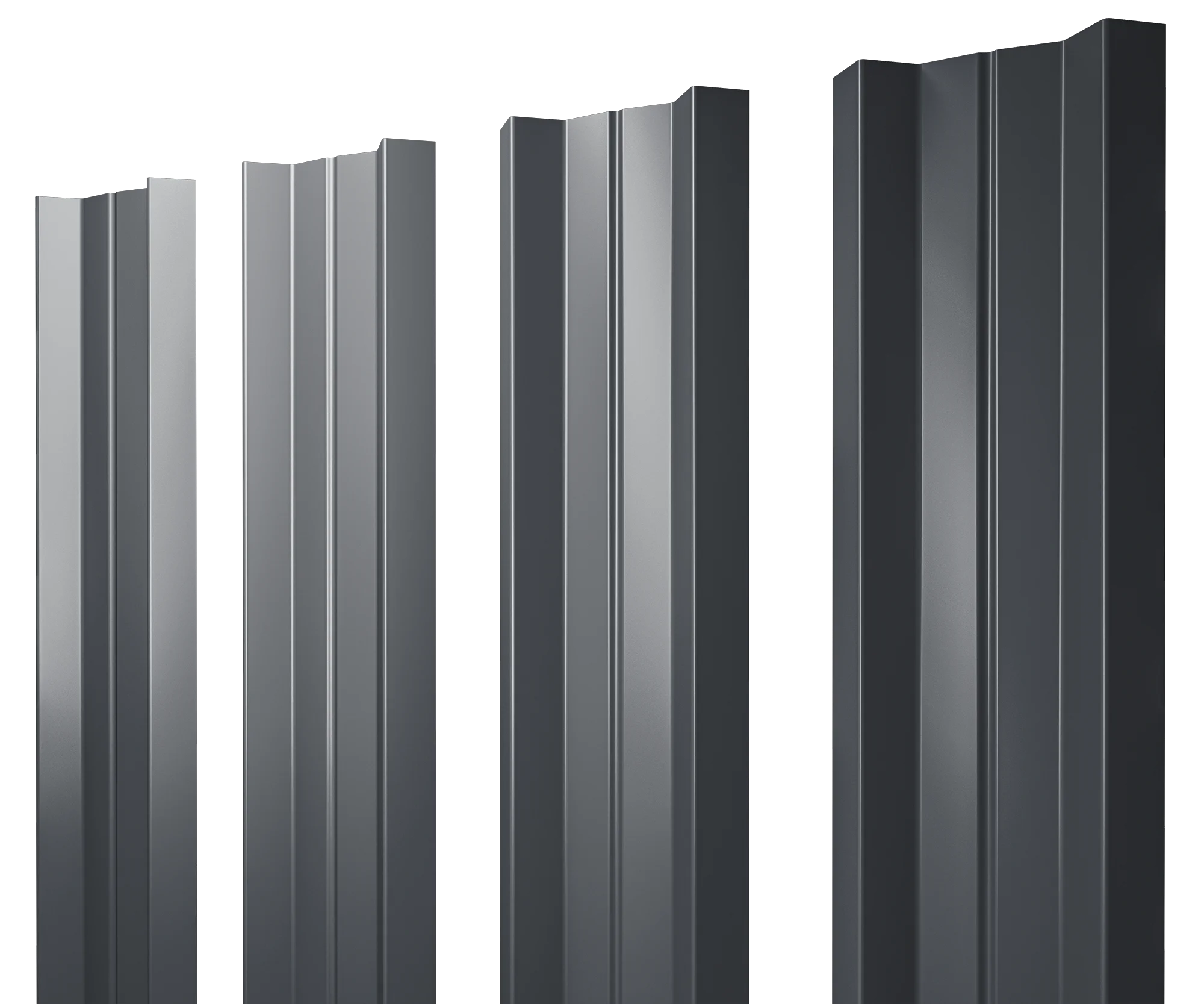 Уникальная форма. Секция ограждения имеет выпуклую во внутреннюю сторону центральную часть. По бокам евроштакетника м-образного 0,35x110 мм серого ral 7024 1м располагаются дополнительные ребра.